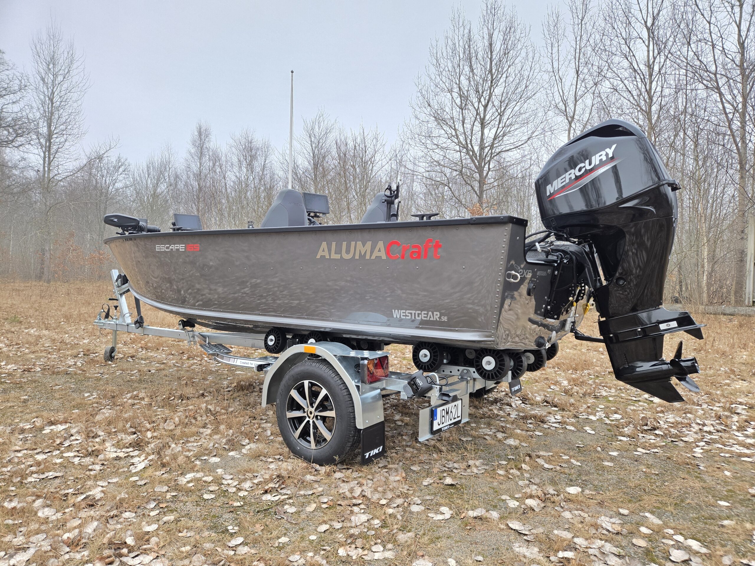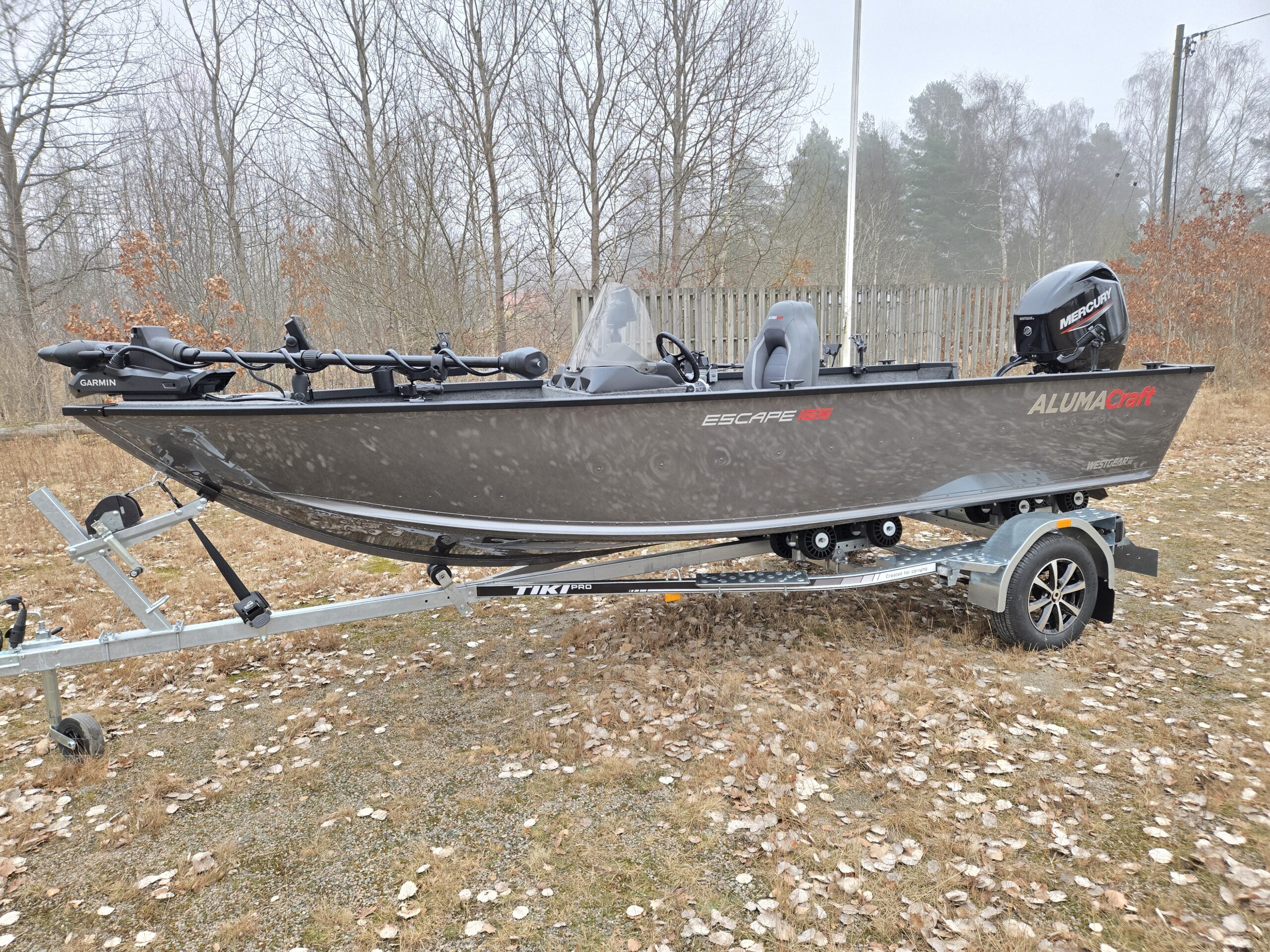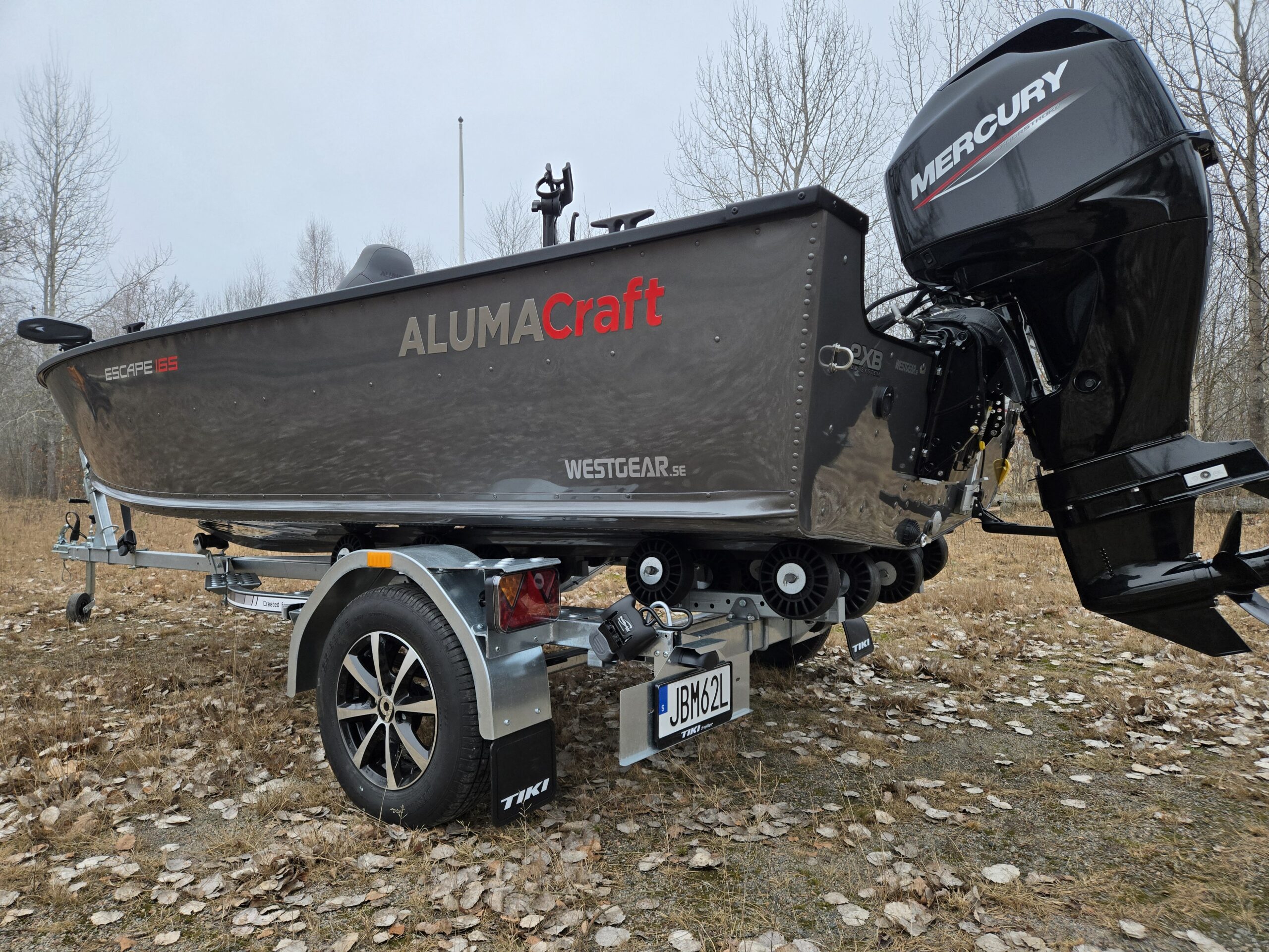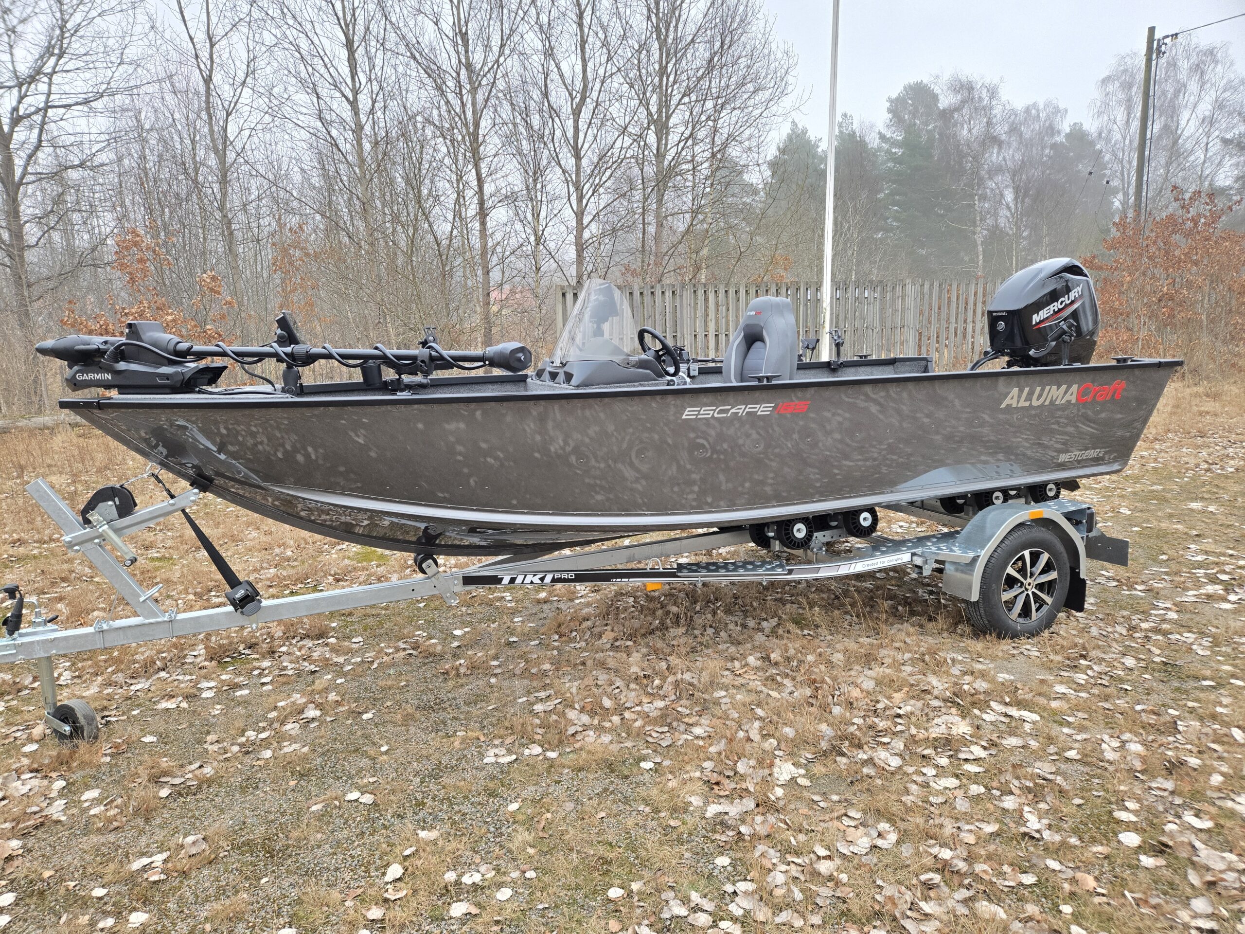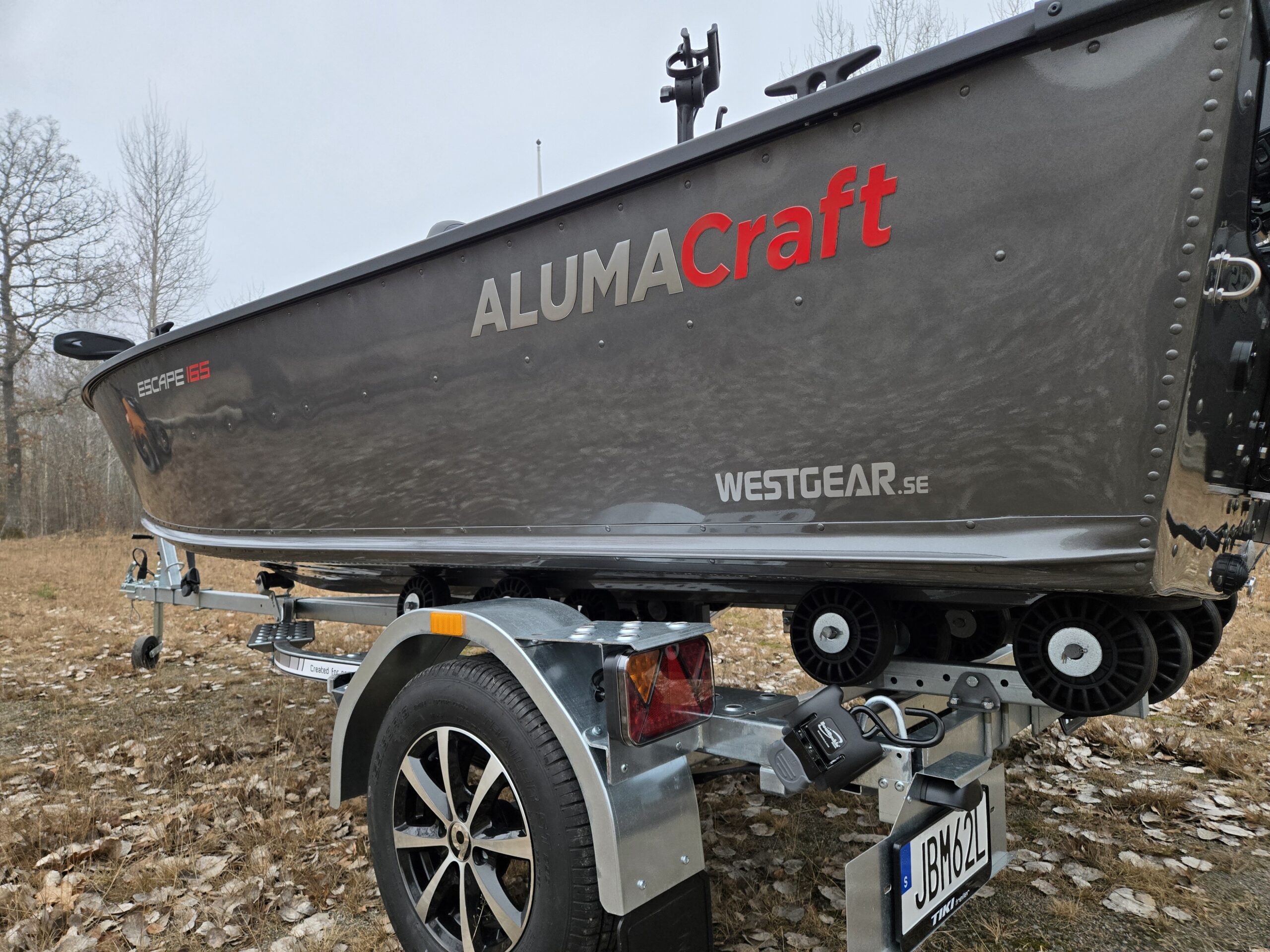 Splashguards, trailerbart kapell, vagga och gångbräda till trailern var de första ”måsteprylarna” som monterades. Därefter blev det det aluminiumfälgar på trailern, som är en Fogelsta 7516U, där även reservhjulet utsmyckats med aluminiumfälg. På relingen har jag monterat åtta ställbara Traxstech-spöhållare som är både snygga och funktionella. Dom sitter fyra och fyra på varsitt rack längst styrbordssidan. Jag har även två likadana spöhållare monterade inne i båten. Skulle jag plötsligt drabbas av trollingfeber är det lätt att flytta över ett 4-pack till babordsidan. Kastdäcket i fören har fått en ryggsparande ”fightingchair” som är skön att ha när man spinnfiskar. Eftersom jag hatar allt vad regn innebär har jag även köpt en Bimini Top som är guld värd när solen steker både för mig och hundarna som ofta är med i båten. Med en Bimini Top blir fiskepassen längre. Efter att kajkat omkring i de mest obekväma farkoster tidigare i livet är det nu komfort som gäller. Därför har även en så kallad ”kaptensstol” införskaffats. Detta är en stol som kan jämföras med den skönaste TV-fåtölj – vi snackar sittkomfort värdig en blåblodig kunglighet! Risken är väl att man somnar så fort bakpartiet landar i det lyxiga lädret. Jag njuter av varje sekund i min Escape 165. En fullfjädrad sportfiskemaskin från Alumacraft med kvalitet och känsla rakt igenom! Alumacraft family forever!”